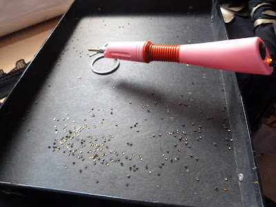 Esta falda lleva un diseño de corazones en dorado por el bajo, para hacerlos utilicé vinilo dorado pegado con pegamento para tela, bordeado con cola de ratón negra y decorados por dentro con más cristalitos hotfix.